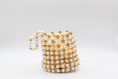 Introducing the GC Bucket Pearl Bag in White Gold, a captivating handcrafted accessory by Grace Creatives. This exquisite bag seamlessly blends st...